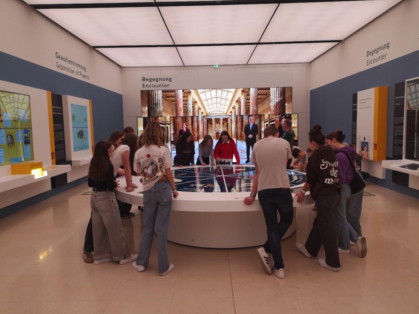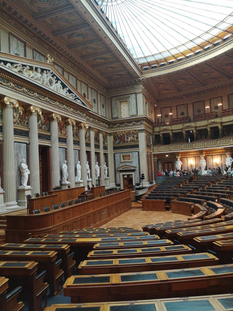 Mehr oder weniger ausgeschlafen besichtigten wir am Montagvormittag das Parlament inklusive einer Führung durch das Gebäude. Neben vielen Räumen, in denen Politik gemacht wird, gingen wir auch durch einen großen Saal. Da die Akustik in diesem Raum sehr beein-druckend ist und die Führerin uns das irgendwie zeigen wollte, bat sie uns ein Lied zu singen. So standen wir dann singend im Parlament. (Kann auch nicht jeder von sich behaupten!)