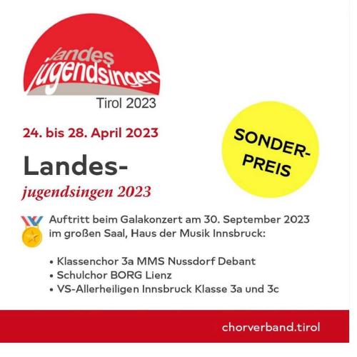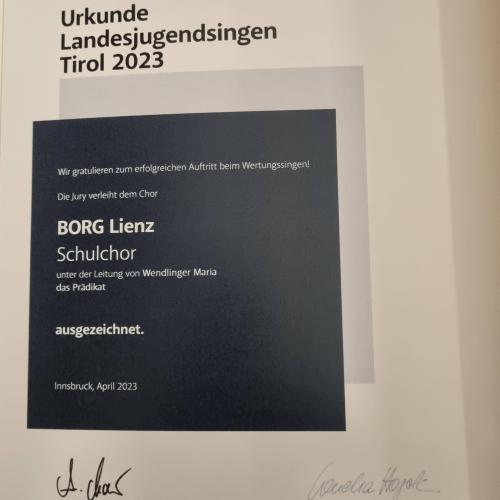 Von 24. - 27. April fanden im SZentrum in Schwaz die Wertungssingen zum Landesjugendsingen 2023 statt. Beim großen Festakt am 28. April im Congress Innsbruck konnte die stolze Chorleiterin Maria Wendlinger im Beisein der Sängerinnen und Sänger für den BORG Chor Lienz die Urkunde mit dem Prädikat "Ausgezeichnet" in Empfang nehmen. Außerdem erhielt der Chor einen Sonderpreis - die Einladung zu einem Konzert im Haus der Musik in Innsbruck am 30.9.2023!