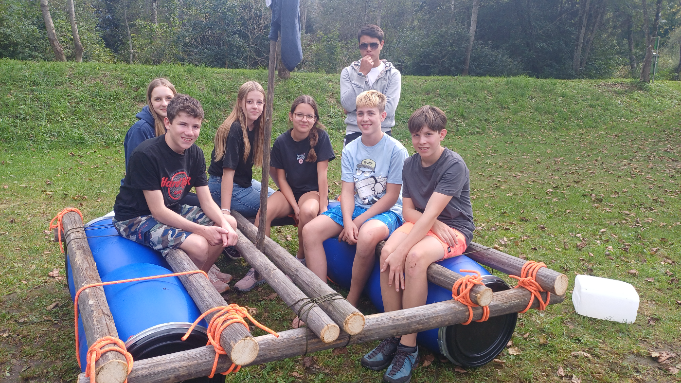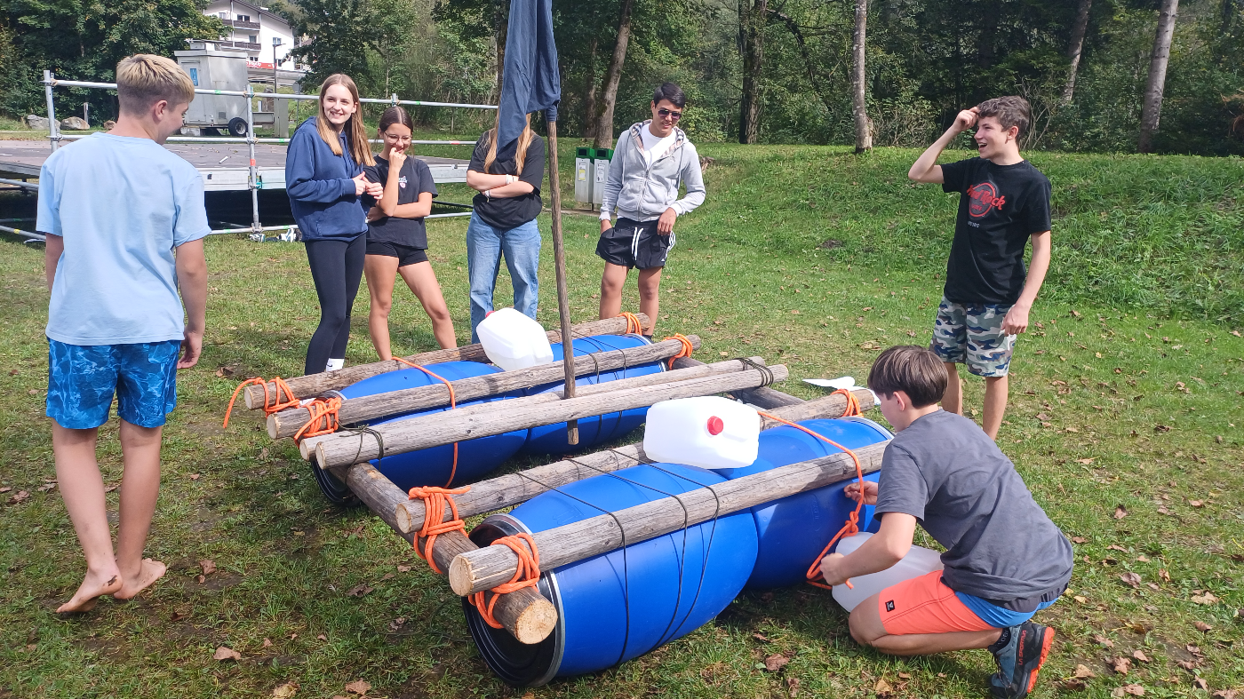 Beim Floßbau bekam die 5M Material und Anleitungen, um jeweils im Team ein eigenes Floß zu bauen, mit dem am kleinen See ein Parcours gefahren wurde.