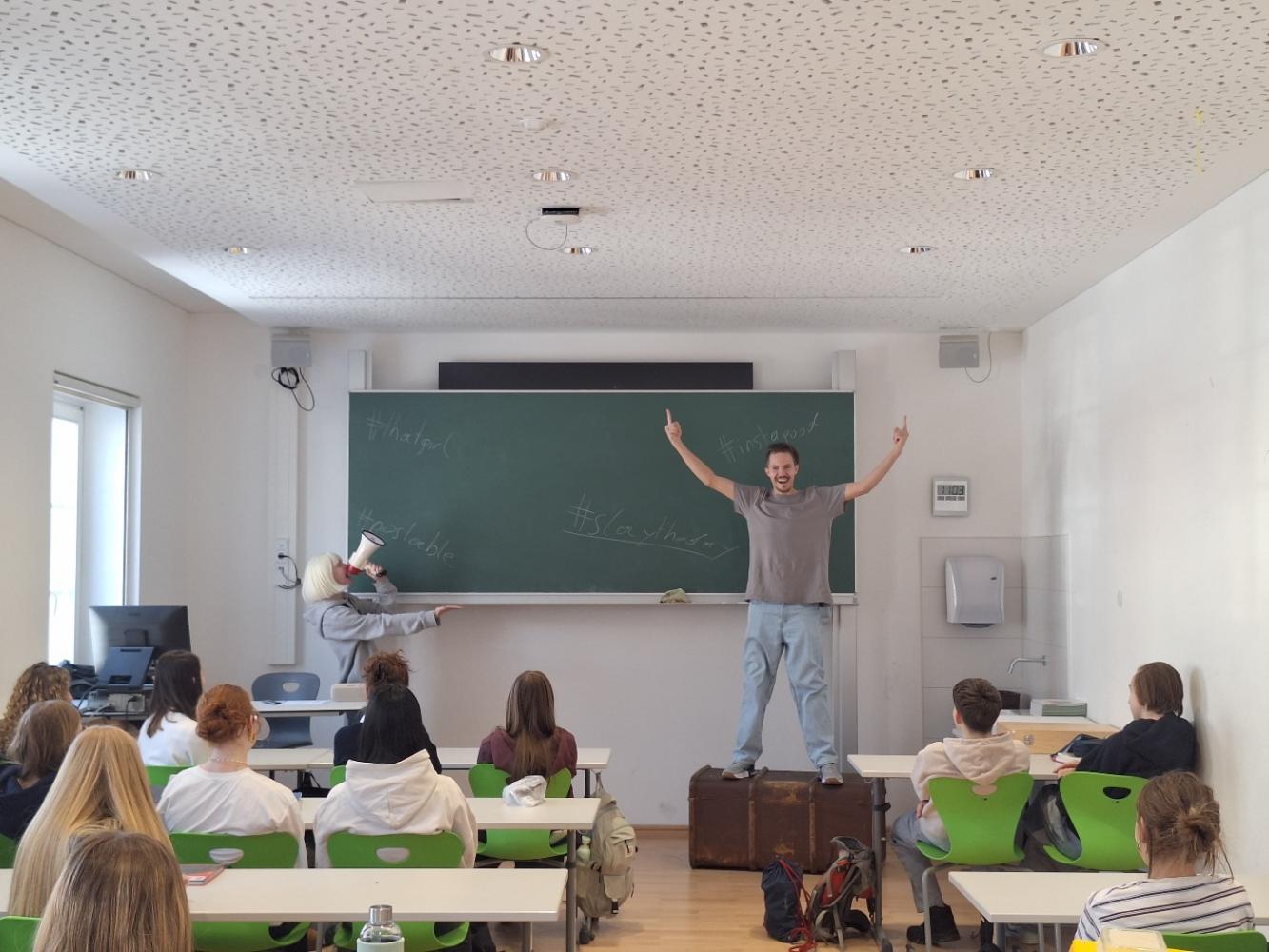 An drei aufeinanderfolgenden Tagen verwandelten sich die Klassenräume in Bühnen. In unmittelbarer Nähe zu Schüler:innen wurden aktuelle und lebensnahe Themen aufgegriffen: Künstliche Intelligenz, Social Media, Gaming, familiäre Konflikte, Magersucht und vieles mehr.